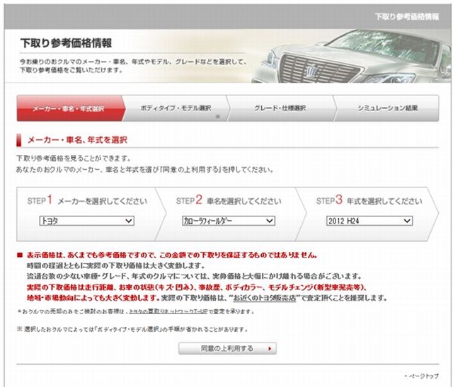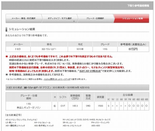例えばTOYOTAのサイト、toyota.jp ご購入サポート | 下取り参考価格情報