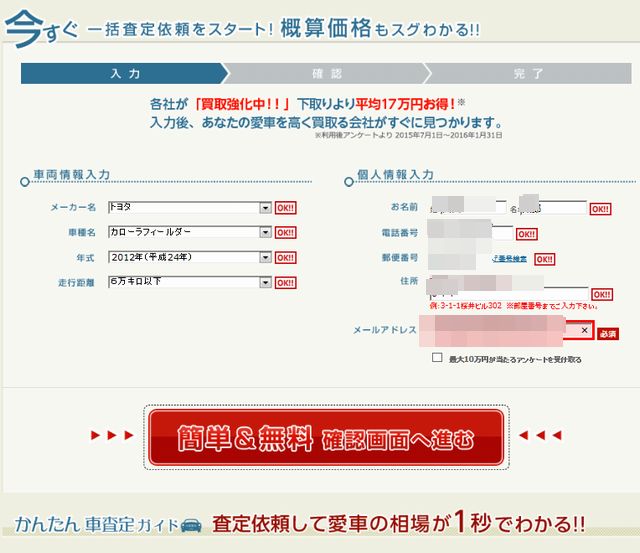 トヨタよりも随分安いですね。やはり他メーカーの車の査定は低めになるのでしょうか。こちらのサイトもボディカラー、走行距離の入力項目がありませんでした。
